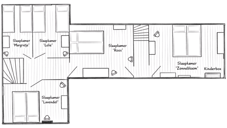 Op de eerste verdieping zijn vijf slaapkamers. In vier slaapkamers staan twee enkele bedden die ook tegen elkaar kunnen worden gezet. In de master bedroom (Roos) staat een tweepersoonsbed met een kaptafel en een vaste kledingkast. Er zijn eenvoudig verplaatsbaar een kinderledikant en een kindercampingbed aanwezig waardoor er zelfs twee kleine kinderen kunnen slapen. In een slaapkamer (Zonnebloem).