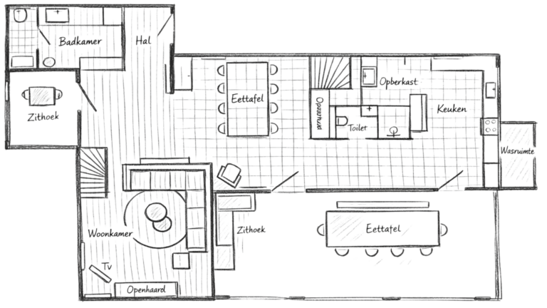 De indeling van de villa bestaat uit een kleine hal, een ruime woonkamer met een hoekbank rond een schouw met houtkachel en een kleine keuken met wasmachine en koelkast naast een badkamer met inloopdouche, wastafel en toilet. In het midden van het huis is een sfeervolle eetkamer met een grote tafel met 10 stoelen en een openhaard. Apart daarachter ligt de royale keuken voorzien van alle apparatuur. Naast de keuken is de tweede badkamer met douche en wastafel. Tussen de keuken en de eetkamer is nog een tweede toilet.